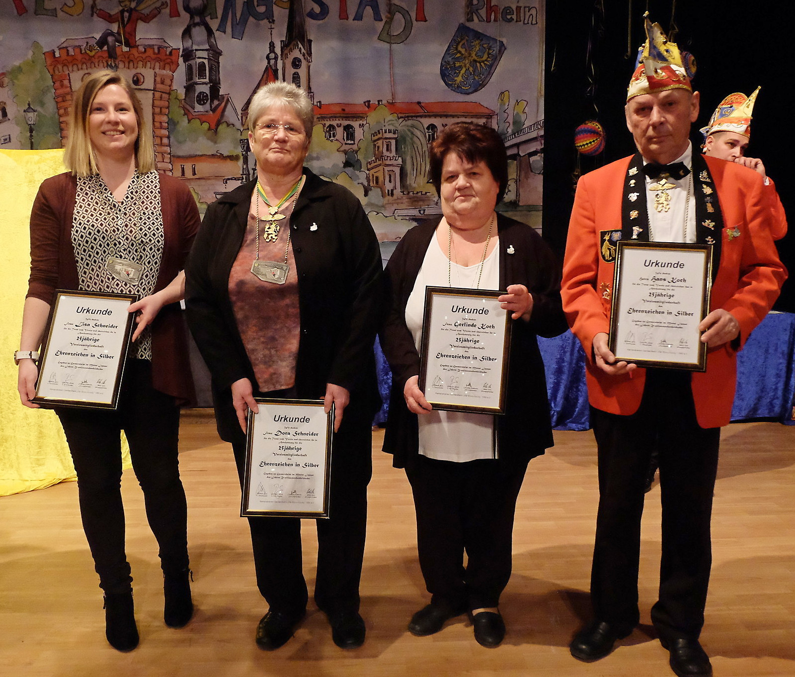 Lisa Schneider, Dora Schneider und das Ehepaar Koch wurden für 25 Jahre Vereinsmitgliedschaft mit der Silbernen Schnake als Anstecker geehrt.