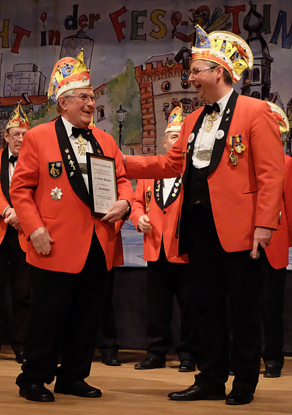 Der Präsident des Ehrensenats der Rhoischnooke, Helmut Paeglow, erhielt für seine Verdienste um den Verein dessen höchste Anerkennung, die Ehrenmitgliedschaft.
